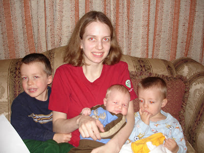 Brian and William have fun yelling, "boo!" and tell me they are scaring monsters away. This has been a fun game for them for weeks, but I think Brian's imagination is getting the better of him. He won't go into a darkened room until he scares the monsters out and asks for the light on. Tonight he came to get me and told me there was a monster in his room. I said, "There's a monster in your room?!" thinking he was playing. He about jumped on my lap and held me tight, terrified that there really was a monster there!!! I keep telling him, "There are no monsters anywhere! God didn't make any! Mommy, Daddy, and God will keep you safe." I'll have to tell William not to play monsters anymore.